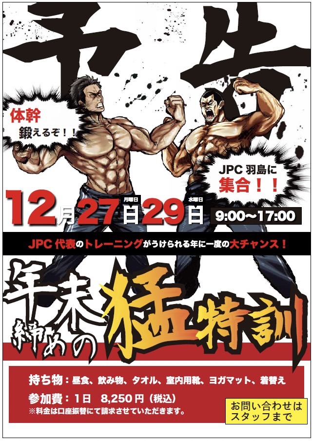 12月27日(月)・29日(水) 9:00~17:00 jpcスポーツ教室羽島店で年末の猛特訓を行います。   今年最後のトレーニング、皆様のご参加をお待ちしております。 詳しくはスタッフにお問い合わ...