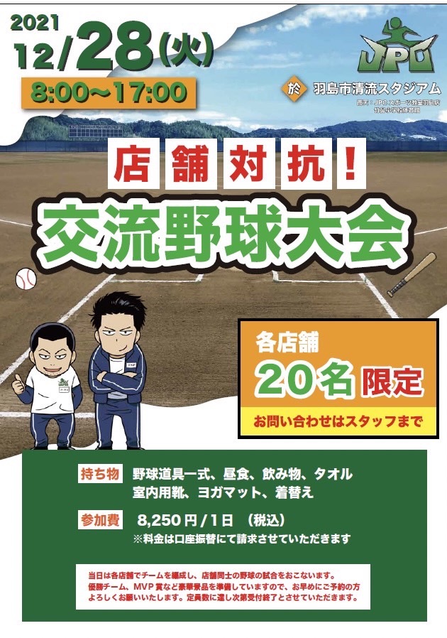 12月28日(火)8時~17時 羽島市清流スタジアムで野球大会を開催します。   様々な店舗の子と野球を通して交流を深めましょう。 優勝チーム、MVP賞などもご用意しております。   詳しくは、スタッ...