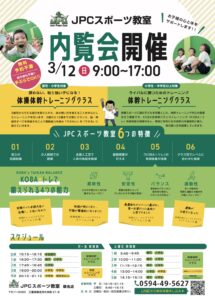 2/26(日)9:00 ~ 15:30 JPCスポーツ教室桑名店 無料体験会を開催いたします。   完全予約制・参加費無料のイベントです。   【各部定員15名】 1部:9:00~9:45 2部:10...