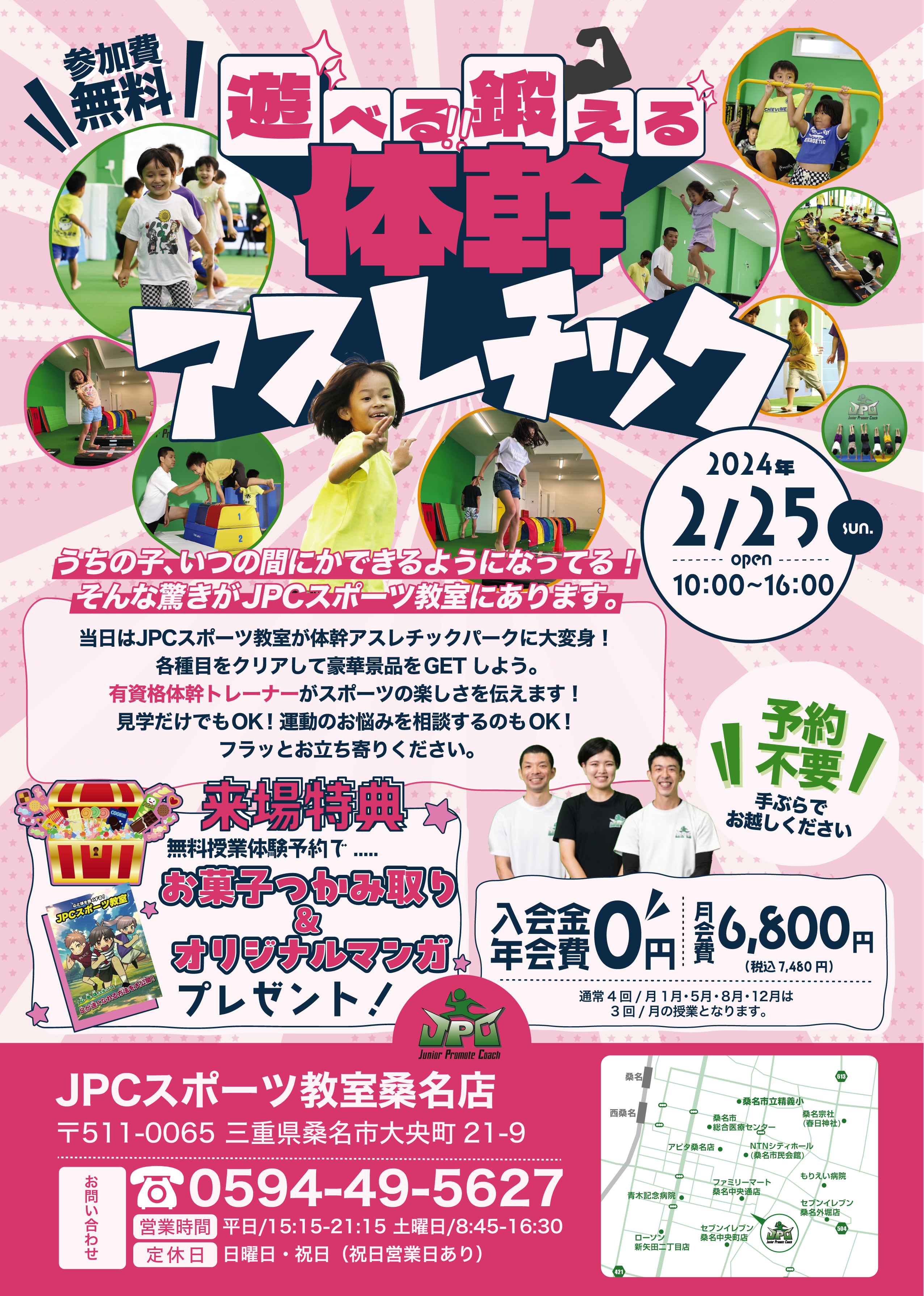 こんにちは! JPCスポーツ教室桑名店です🌈   2024年最初のイベント開催が決定いたしました!   遊べる!鍛える! \体幹アスレチックパーク開催/ 日時 2月25日(日) 10:00~16:00...