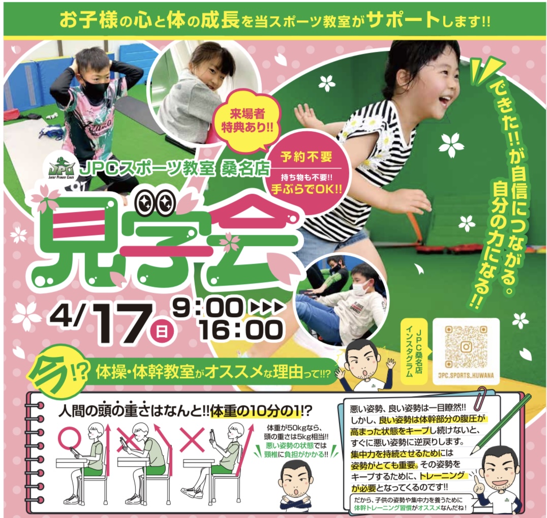 4月17日(日) 9:00 〜 16:00 【 JPCスポーツ教室 桑名店 見学会 】 を開催します🎉   以前より当教室を気になっていた方や、何か新しいことを始めたい方、楽しく身体を動かしたい方、是...