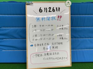 6/26(日)に開催いたします無料開放ですが、2部の10:15~11:15 が定員いっぱいとなりました。   3~5歳のお子様は、1部の9:00~10:00 のお時間であればご参加いただけますので、ご...
