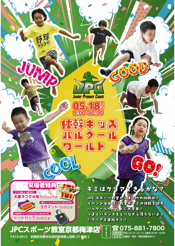 こんにちは! JPCスポーツ教室 京都梅津店です! 5/18(日)『体幹キッズパルクールワールド』を開催いたします! 時間は9:00〜17:00、参加費・予約不要🆗 運動が好きなお子様、スポーツ教室の...