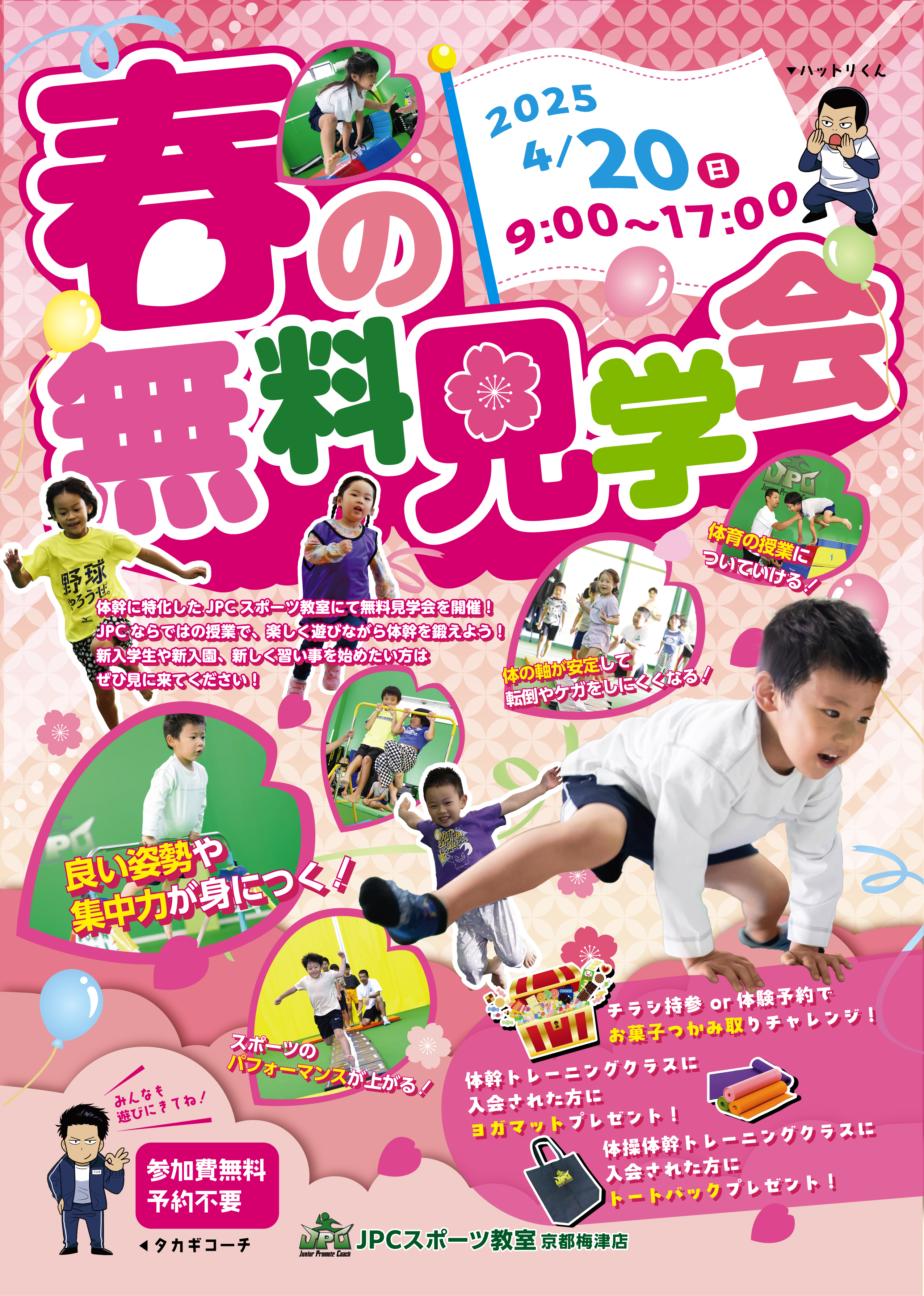 こんにちは! JPCスポーツ教室 京都梅津店です! 4/20(日)春の無料見学会を開催決定🌸 時間は9:00〜17:00、参加費・予約不要🆗 遊べる簡単なコースをご用意しておりますので、ぜひお子様を連...