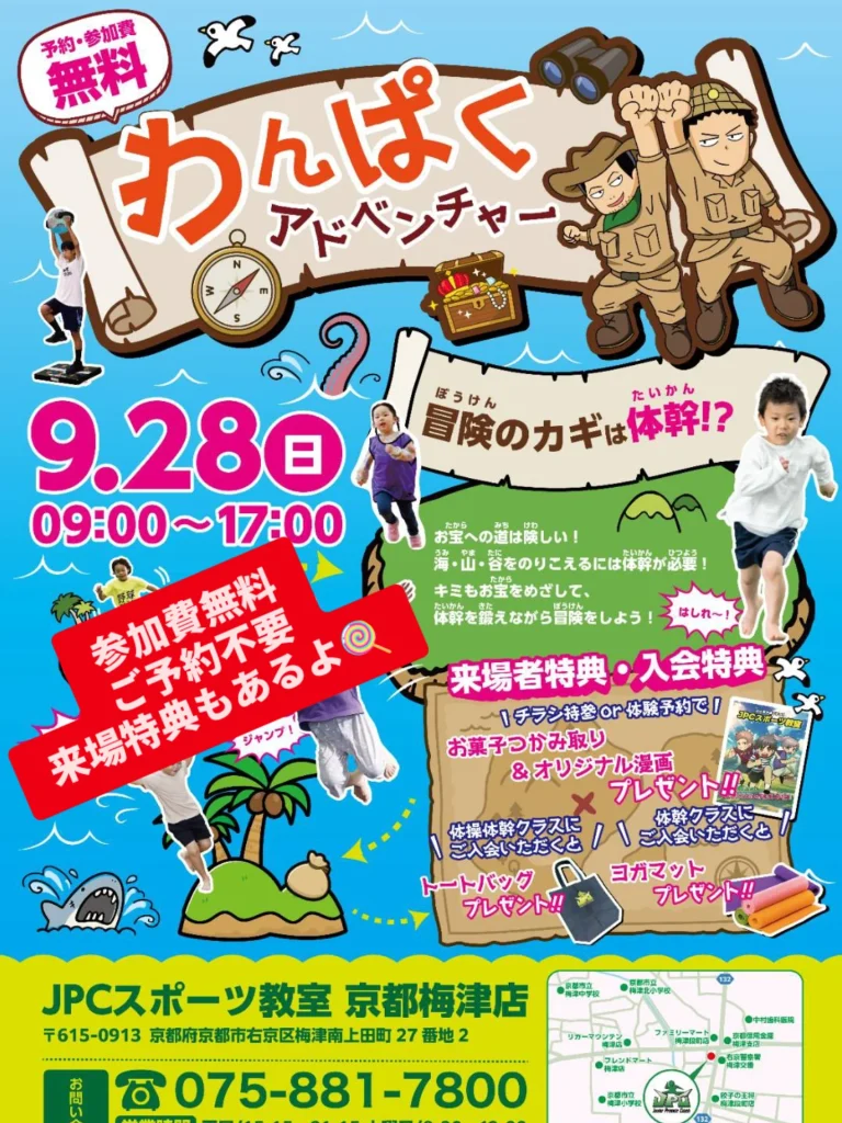 こんにちは! JPCスポーツ教室 京都梅津店です! 9/28(日)『わんぱくアドベンチャー』を開催いたします! 時間は9:00〜17:00、参加費・予約不要🆗 運動が好きなお子様、スポーツ教室の雰囲気...