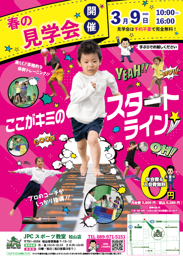 🌸 春の内覧会のお知らせ! 🌸 JPCスポーツ教室松山店では、春の訪れとともに 「春の内覧会」 を開催いたします! 🎉✨ スポーツ教室の雰囲気を知りたい方、運動が好きなお子さま、新しい習い事を検討中の...
