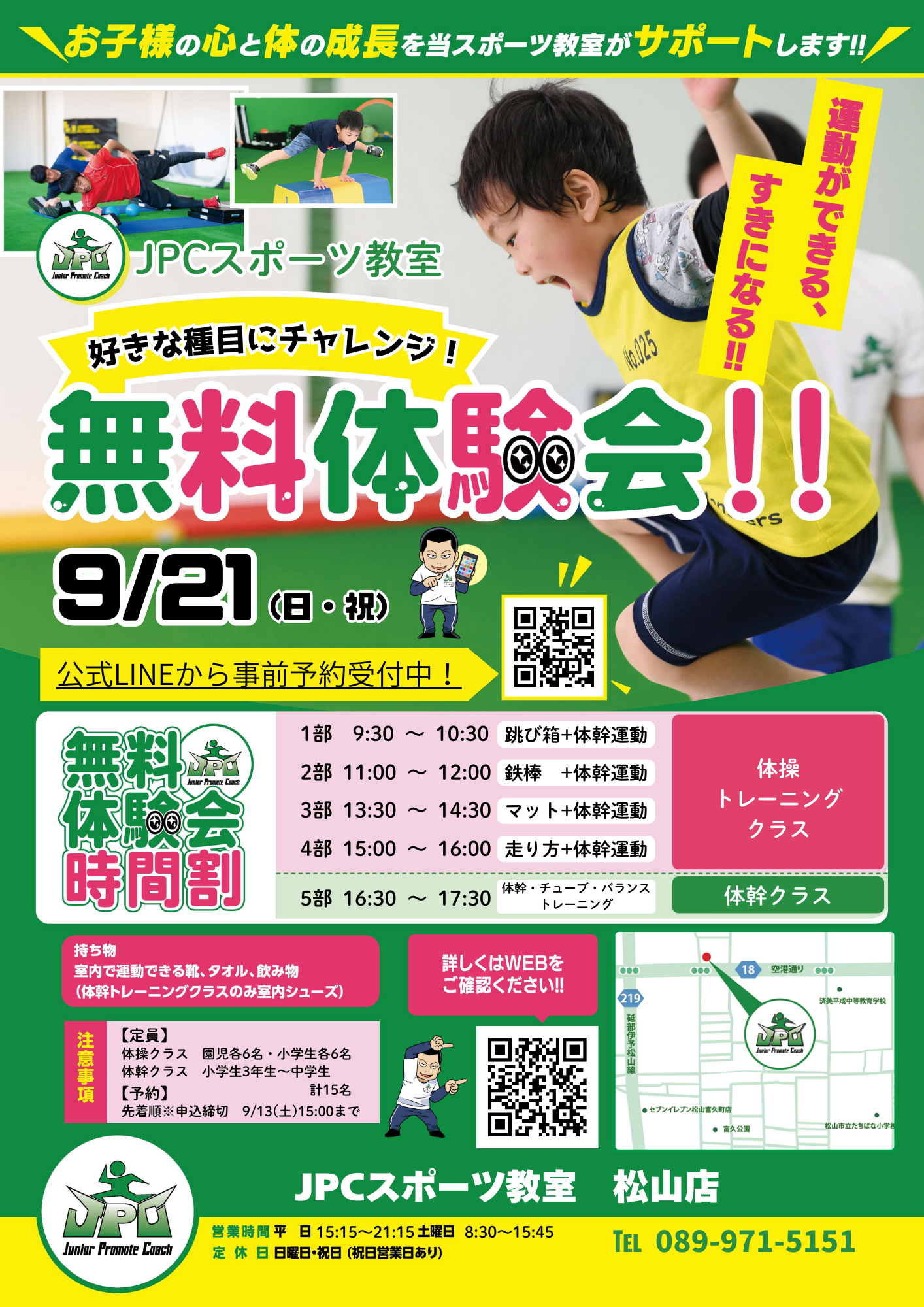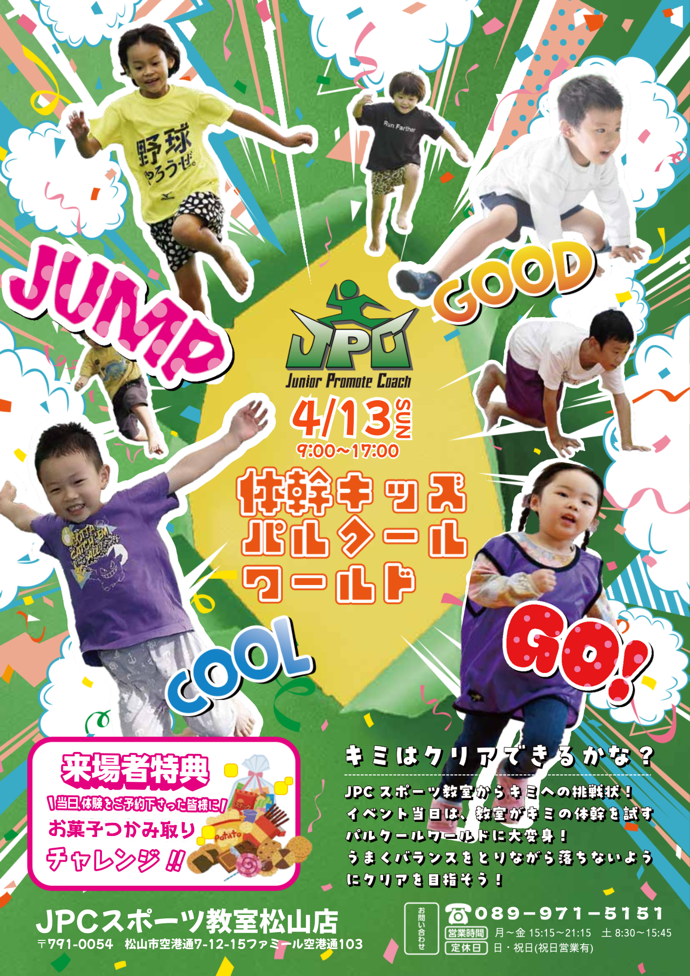 🔥体幹キッズパルクールワールドのお知らせ! 🔥 JPCスポーツ教室松山店では、「体幹キッズパルクールワールド」 を開催いたします! 🎉✨ 運動が好きなお子さま、スポーツ教室の雰囲気を知りたい方、新しい...
