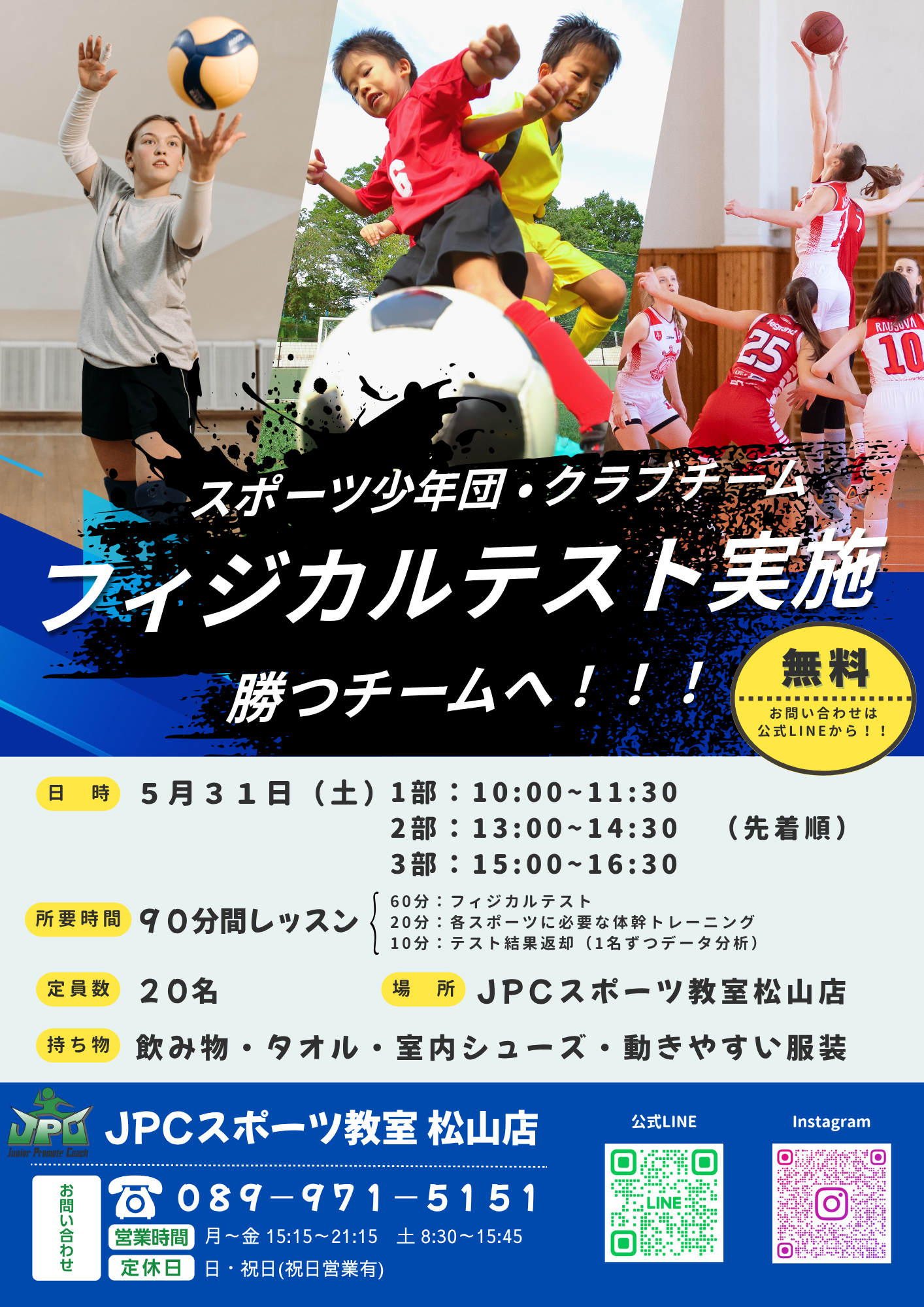 JPCスポーツ教室松山店です。 本日はイベントの告知をさせていただきます‼️ 🏋🏻‍♀️フィジカルテスト 実施!!🏋🏻‍♀️ チームスポーツや団体競技のコーチ、監督、保護者様 必見👀✨ 〜JPCスポー...