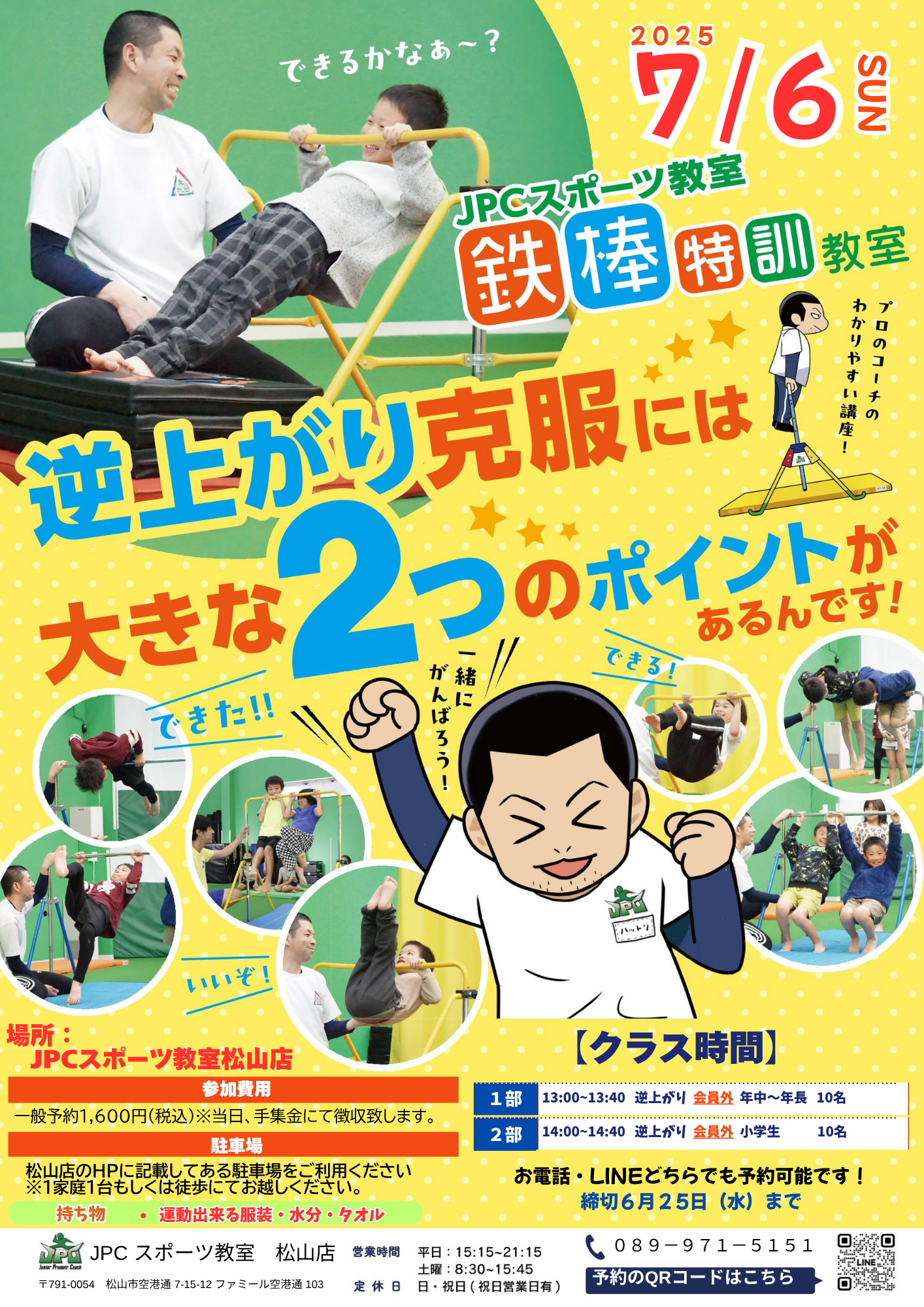 JPCスポーツ教室松山店です。 7月6日(日)に"鉄棒特訓教室"を開催しました‼️ 満員御礼での開催となり、たくさんの子どもたちが元気いっぱいにチャレンジする姿が見られました💪 できなかったことが、で...