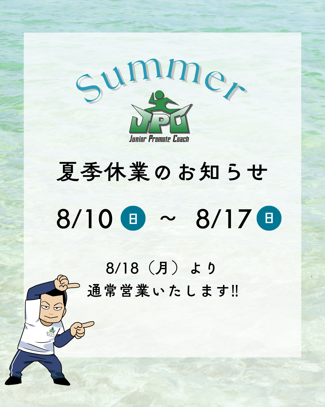 JPCスポーツ教室松山店です! 平素よりお世話になっております。 【夏季店休日のお知らせ】 8月10日(日)~8月17日(日)まで店休日とさせていただきます🍃 期間中はご連絡がつきにくくなる可能性がご...