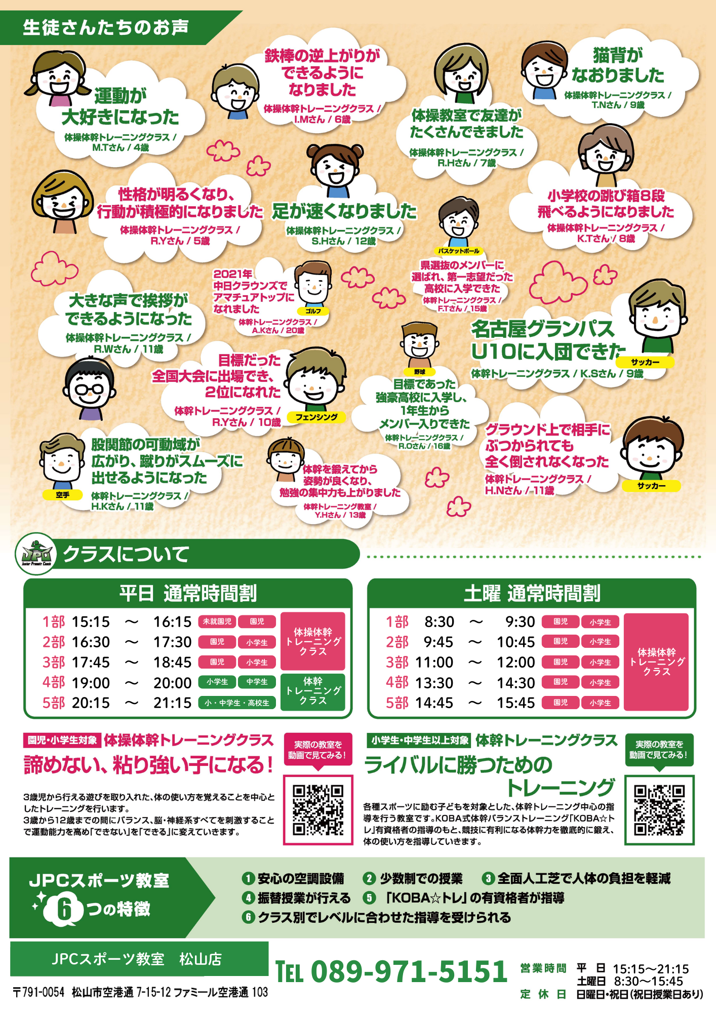 内容としては、年齢や運動経験に応じた少人数制プログラムとなり、体幹運動を取り入れた構成により基礎体力の向上、ニーズに合わせた種目別体験となります。