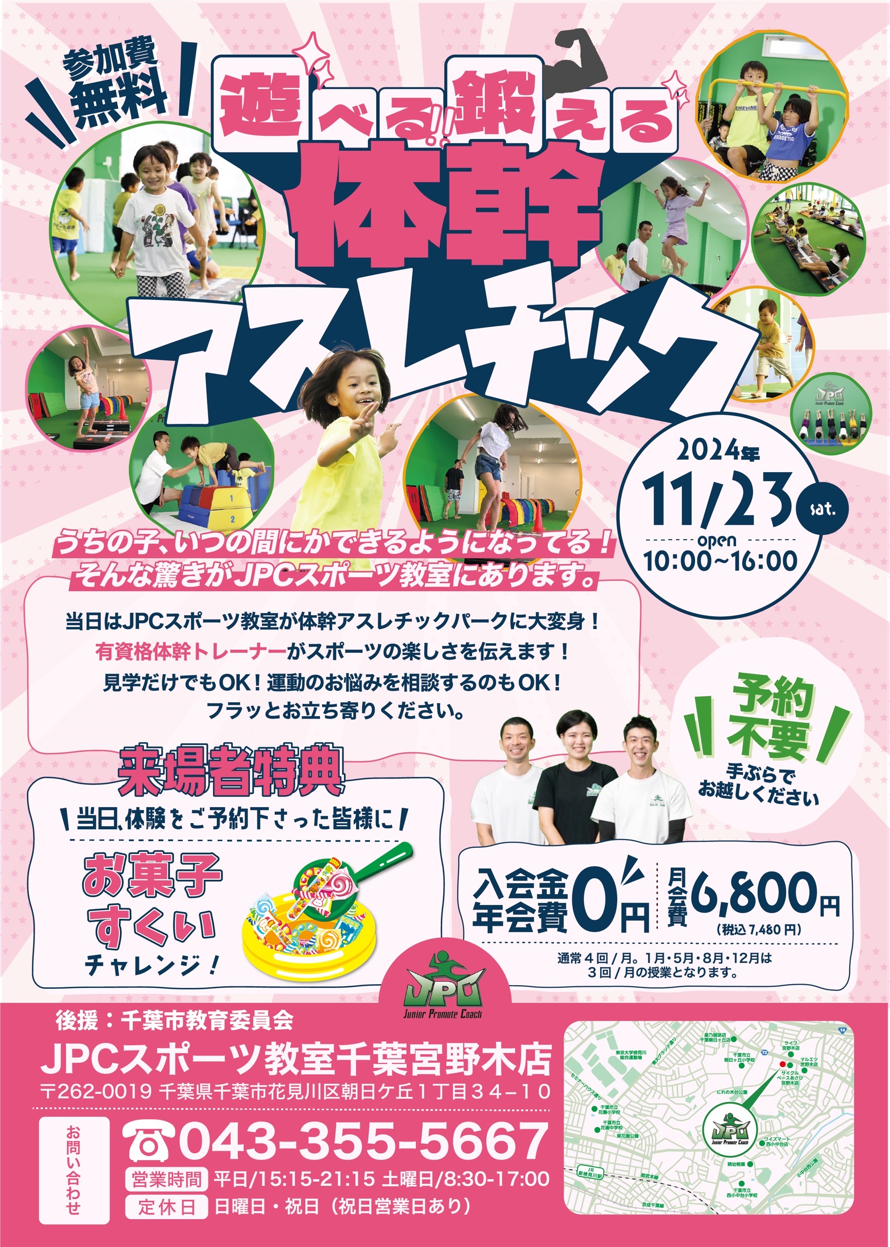 2024年11月23日(土)体幹アスレチックパーク開催決定‼ いつものJPCスポーツ教室がアスレチックパークに大変身して、みんなを待ってます‼   場所:JPCスポーツ教室千葉宮野木店 日時:2024...