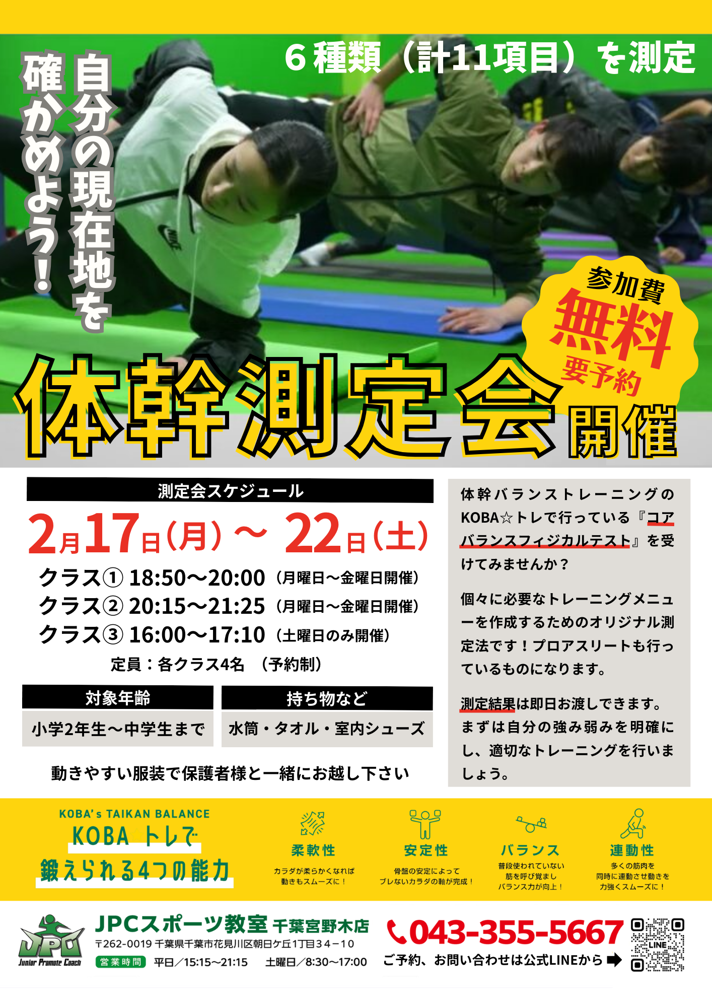 日時:2月17日(月)~22日(土) 参加費:無料   【体幹無料測定会】 体幹バランストレーニングのKOBA☆トレで行っている『コアバランスフィジカルテスト』の無料測定会を開催します...