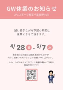 こんにちは!! つかコーチです(^^)/ 4月はたくさんの無料体験、入会いただきありがとうございます(*^-^*) ゴールデンウイークお休みのお知らせです!! 4月28日(日)~5月7日(火)まで休業...