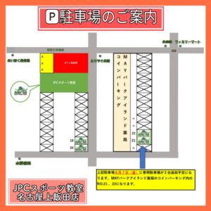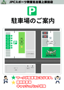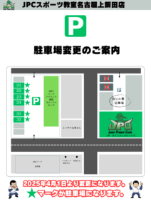 JPCスポーツ教室名古屋上飯田店の駐車場が変更になりました。 ★マークが駐車場になります。 お間違えのないようにご注意下さい。 宜しくお願い致します。 JPCスポーツ教室名古屋上飯田店