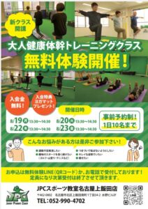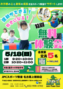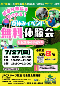7月27日(日)無料体験会を開催致します! 実際の授業受けられるチャンス! ホームページ、公式LINEで受付しております! 「JPCスポーツ教室名古屋上飯田店」