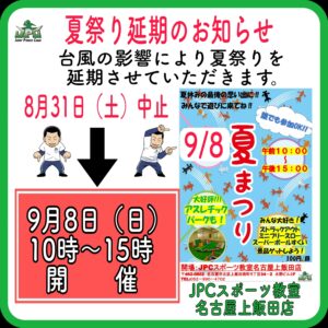 8月31日(土)に開催を予定しておりました『夏祭り』ですが、台風の影響により延期させて頂きます。 お子様をお連れしてきていただく方多くいらっしゃるので、安全の観点でこの様な判断をさせて頂きました。 天...