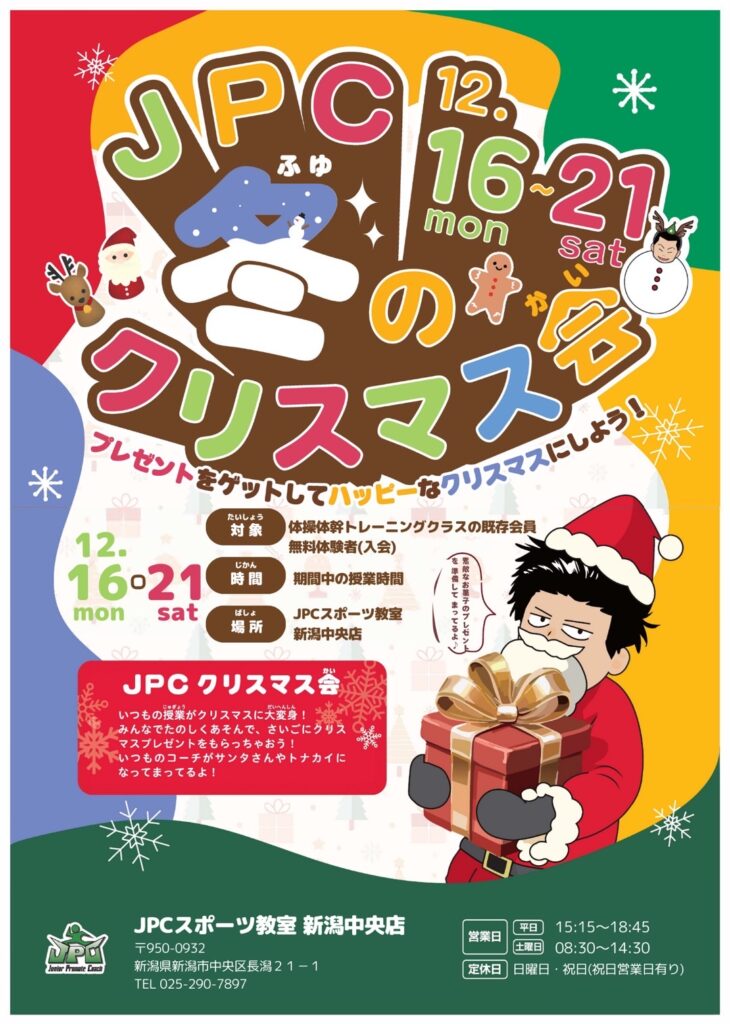こんにちはJPCスポーツ教室新潟中央店のみやコーチです! 12月の授業も残り来週で終わりになってしまいます😓 そこで!JPCスポーツ教室新潟中央店では12月16日~21日の一週間クリスマスイベントを開...