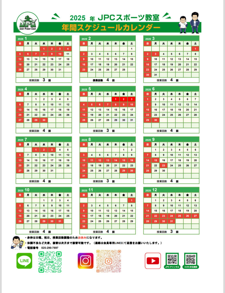 こんにちは!JPCスポーツ教室新潟中央店のみやコーチです🦍 2025年!来年のカレンダーが出来ました~!🎉🗓️ 来年の授業開始が1月11日からなのでお間違いなくお越しください🫡 なお、長期休暇のため教...