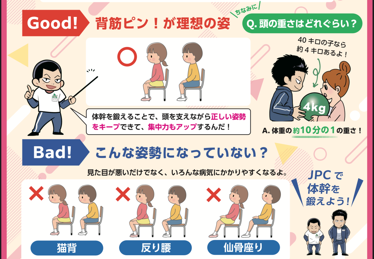 宿題中や食事中、 「背中が丸くなってるな…」と感じたことはありませんか? 姿勢は“気をつければ直るもの”と思われがちですが、 実は 姿勢を支える体幹の力不足 が原因になっているケースが多くあります。 ...
