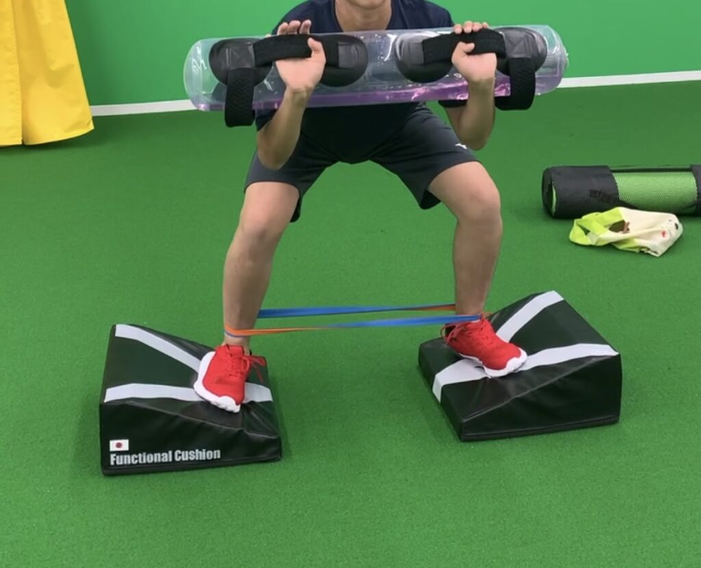 ③背筋は伸ばして、膝と股関節を曲げて体を下ろす