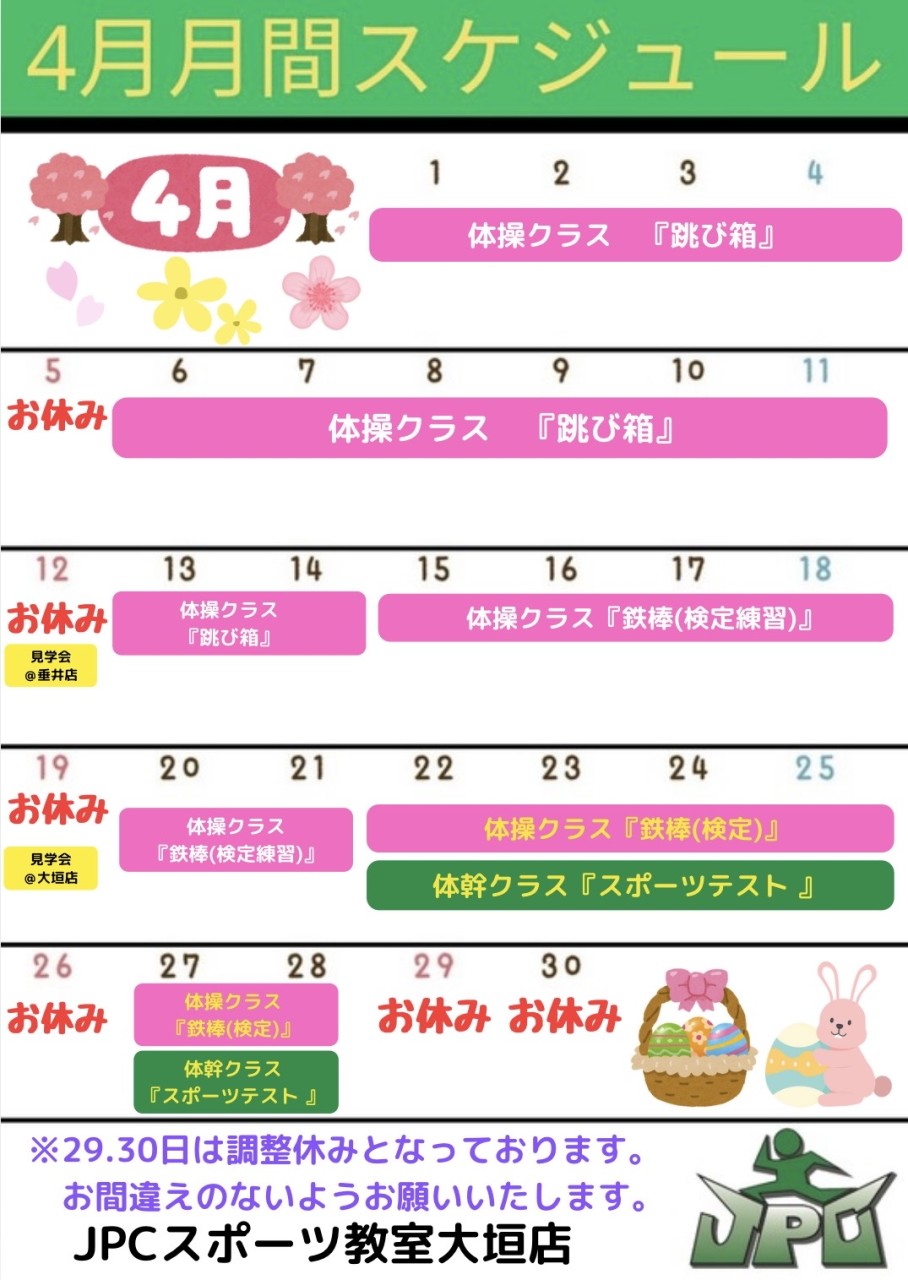 2026年の年間カレンダーと4月の月間カレンダーです。   【4月のスケジュール】 ◇体操クラスは『跳び箱』『鉄棒』 最終週には鉄棒のJPC検定を行います‼️ ◇体幹クラスは『スポーツテスト...