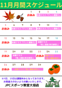 2023年の年間カレンダーと11月の月間カレンダーです! 【11月のスケジュール】 ◇体操クラスは『マット運動』と『陸上運動』です。 最終週には陸上運動のJPC検定を行います❗️           ...