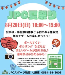 🍉夏の最後のイベントJPC大垣夏祭り🍉 8/20(日)10:00〜15:00 場所:JPCスポーツ教室 大垣店 参加費 : 無料 スーパーボールすくい、ボウリングなど、楽しいゲームが盛りだくさん♪ 🎁...