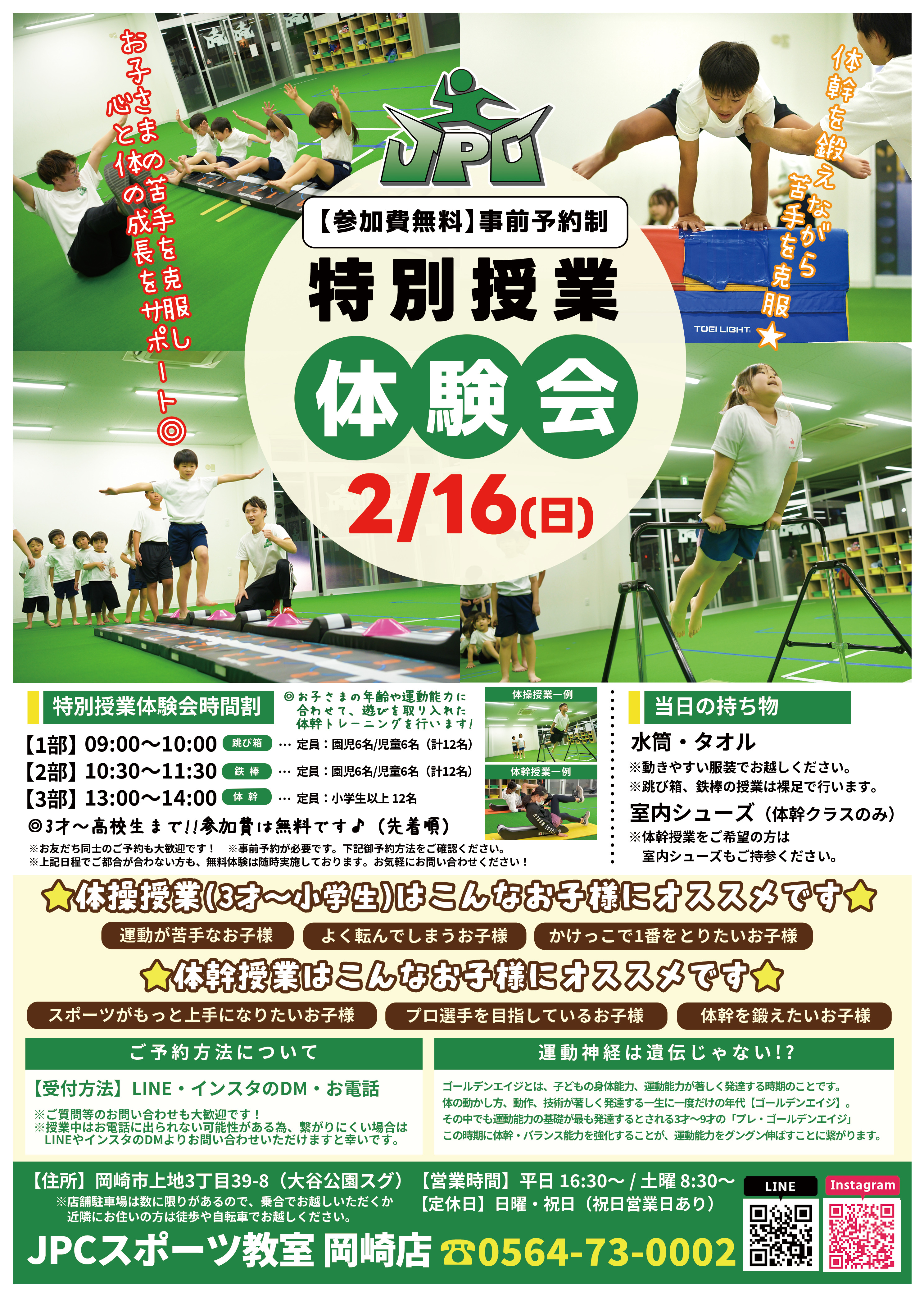 ★特別授業体験会開催★ 【子どもたちの運動能力向上におすすめの体幹教室】 実施日:2月16日(日) ①体操体験クラス(跳び箱) 9:00〜10:00 ②体操体幹クラス(鉄棒) 10:30〜11:30 ...