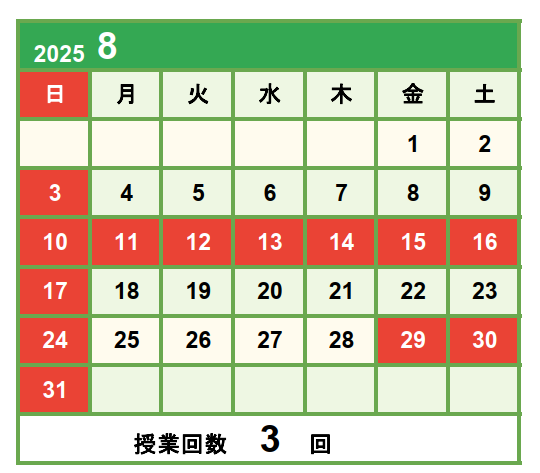 ・休講期間:8月11日(月)~8月16日(土)、8月29日(金)、8月30日(土)