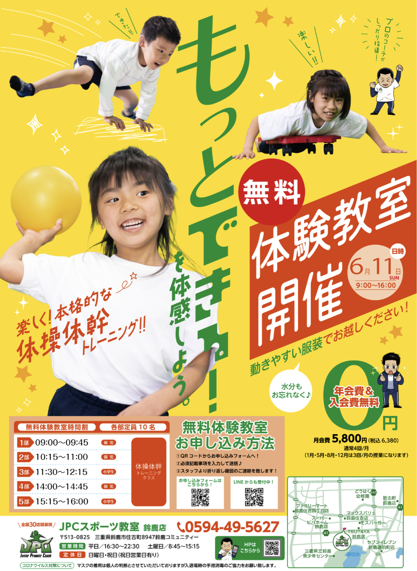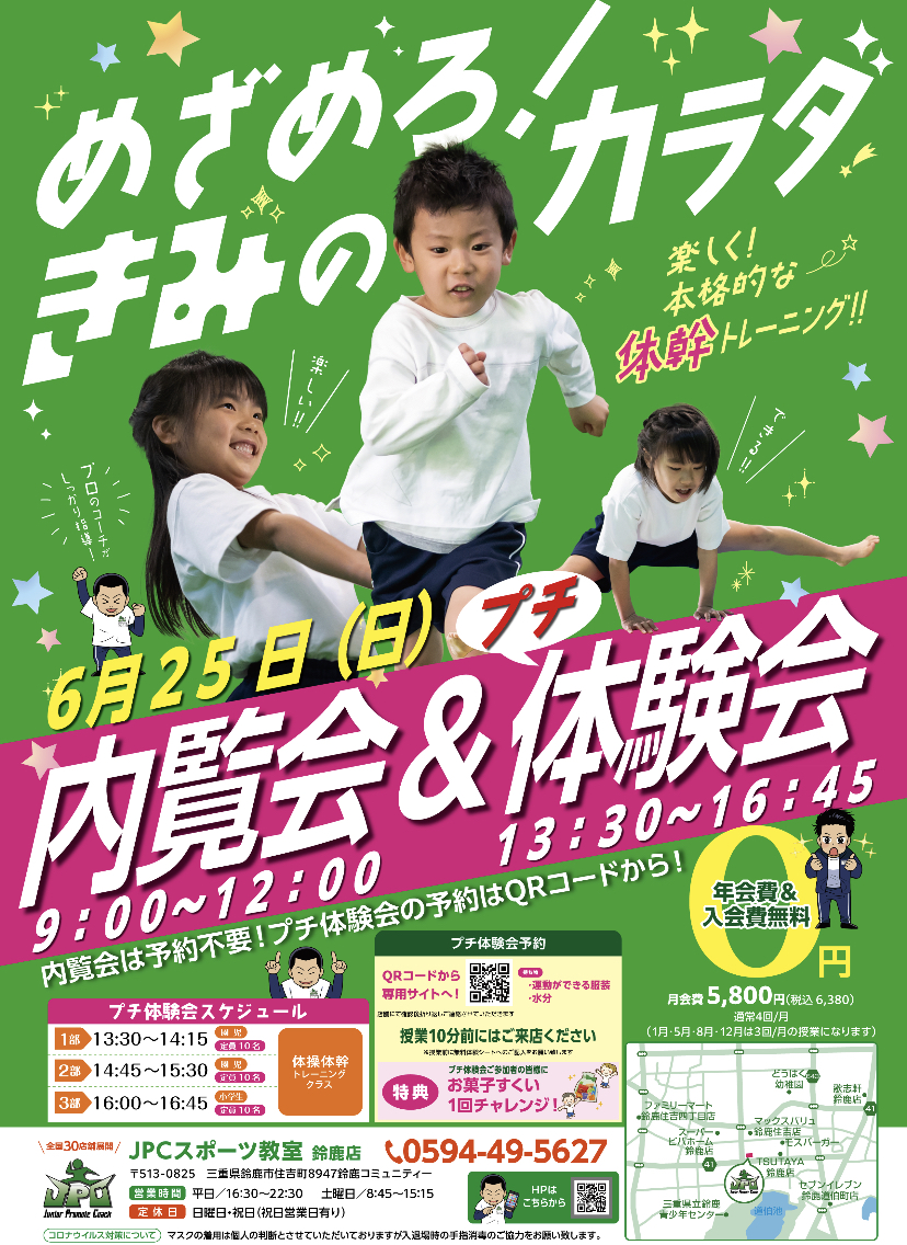 ⠀ 🟩JPCスポーツ教室鈴鹿店🟩 ご好評につき6月イベント第2弾‼️ 【内覧会&無料体験教室 開催😆】 日時:6月25日【日】 ⏰内覧会   9:00-12:00 ⏰体験会   13:30-16:45...