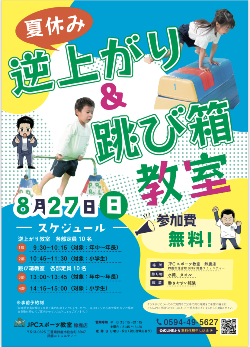 【逆上がり・跳び箱教室】開催😃‼️ ※参加費無料・完全予約制 逆上がりが苦手、跳び箱がなかなか上手に跳べない子集まれ⭐️ 是非ご参加ください! 多数のお申し込みが予想されますので、お早めにお申し込みく...