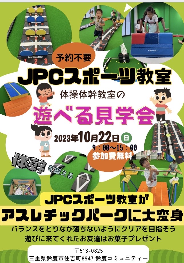 ⭐️遊べる❗️見学会 開催⭐️ 【体幹アスレチックコースにチャレンジ👍】 日時10月22日【日】9:00-15:00 場所:jpcスポーツ教室鈴鹿店 ※無料だよ ※予約不要   JPCスポーツ教室がア...