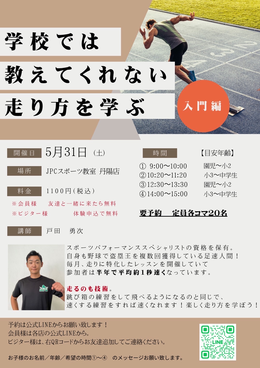5月31日にJPCスポーツ教室丹陽店で、 走り方の特別レッスンを開催します❗️     講師は、浅井店店長の戸田が請け負います🫡 実績は豊富 ・大学野球で、複数回、盗塁王 ・大学野球日本一 ・150名...
