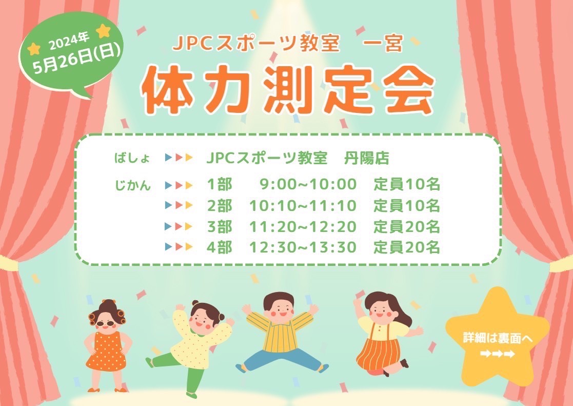 こんにちは、JPCスポーツ教室丹陽店です😊 5月のイベント案内です📣 5月26日(日)9:00〜13:30             学校で体力測定が終わった子もいれば、地域によって運動会がある時期だと...