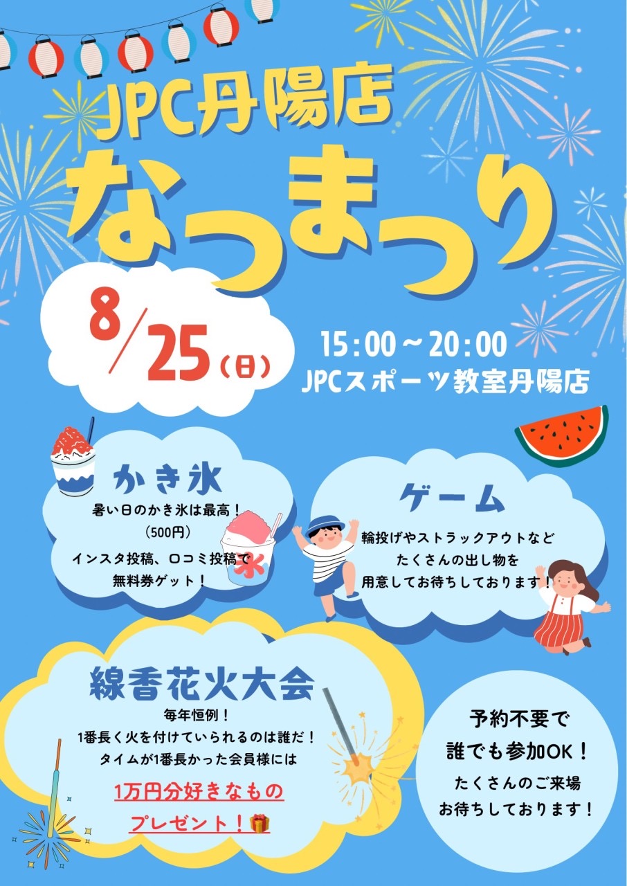 こんにちはJPCスポーツ教室丹陽店です😆 お盆休みも終わり通常通りレッスンが始まります🌟 怪我のないようにしっかりウォーミングアップを行い楽しく体を動かして行きましょう👍💕 【JPC丹陽店なつまつり】...