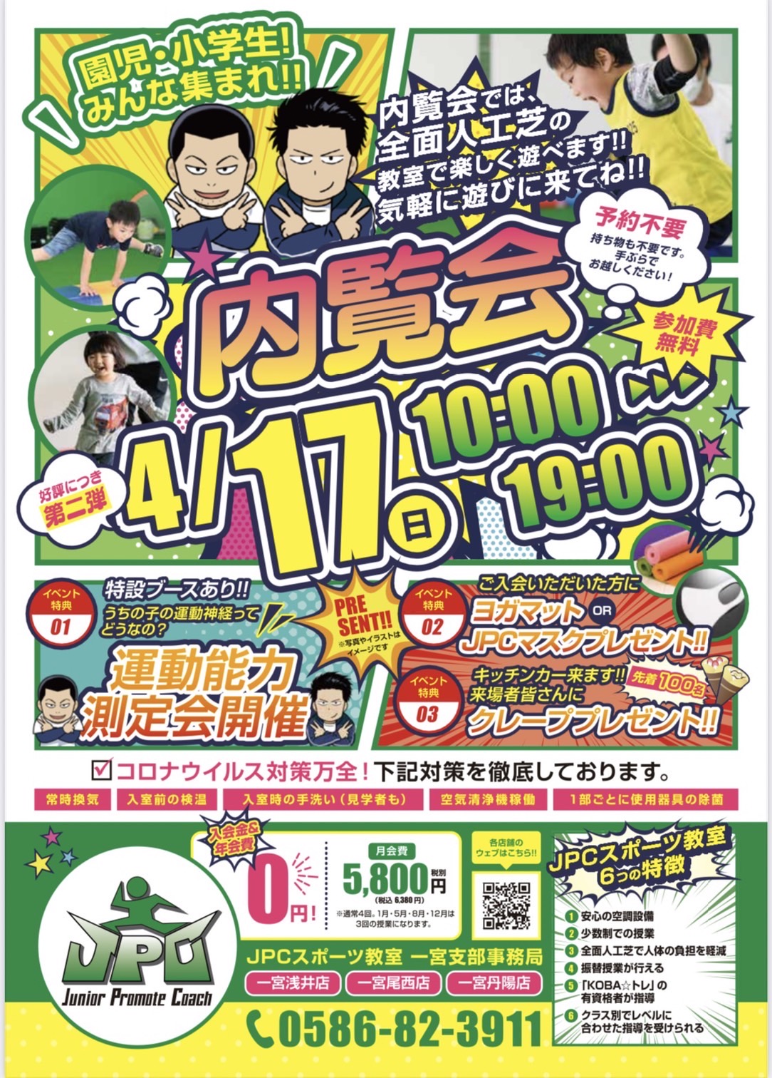 4/17(日)10:00〜19:00 内覧会を開催します🎉 今回は、併せて「運動能力測定会」も行います❗️ この機会にお子さんの運動神経がどのくらいなのか測ってみませんか? スポーツをやっている子...