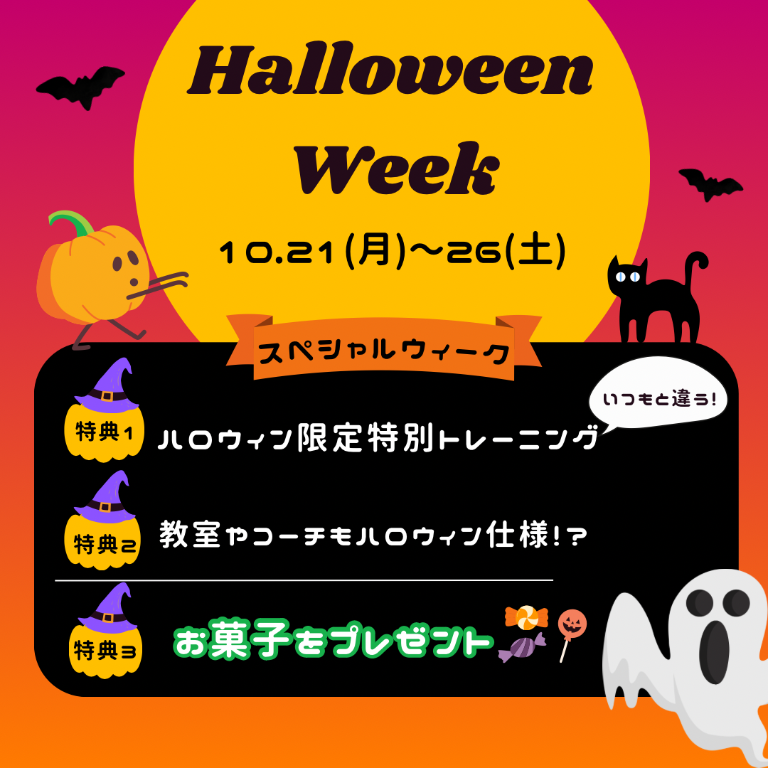 🎃👻Halloween week👻🎃 昨年大好評!今年も開催決定✨ 期間:10月21日(月)〜10月26日(土) 楽しい・嬉しいの1週間になっております☺️   特典1✨ いつものトレーニングがハロウ...