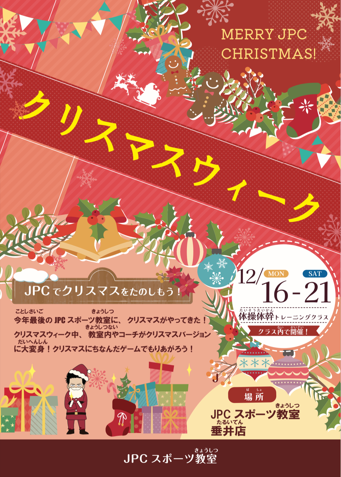 ⛄️クリスマスウィーク開催⛄️ 今年最後のJPCスポーツ教室に、クリスマスがやってきた!🎅✨ 期間中は教室内やコーチたちがクリスマスバージョンに大変身! さらに、クリスマスにちなんだ楽しいゲームで大盛...