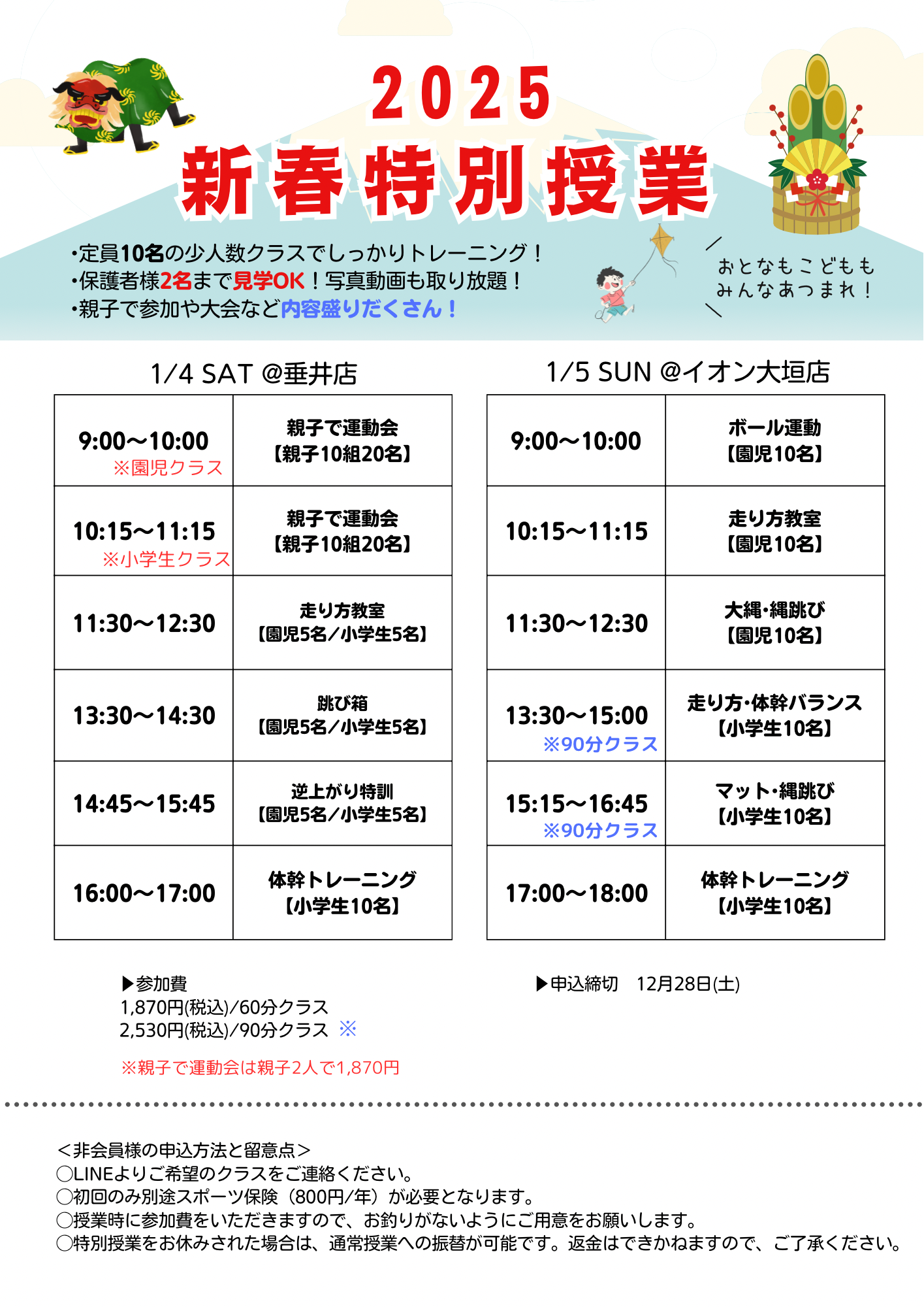 🎍新春特別授業のご案内🎍 ーーーーーーーーーーーーーー 年末に続き、2日連続/2店舗で開催します‼️ 全てのプログラムは2名までご見学可能です🫶 ※通常通り、お子様だけの参加ももちろん🆗 ✳️親子で運...