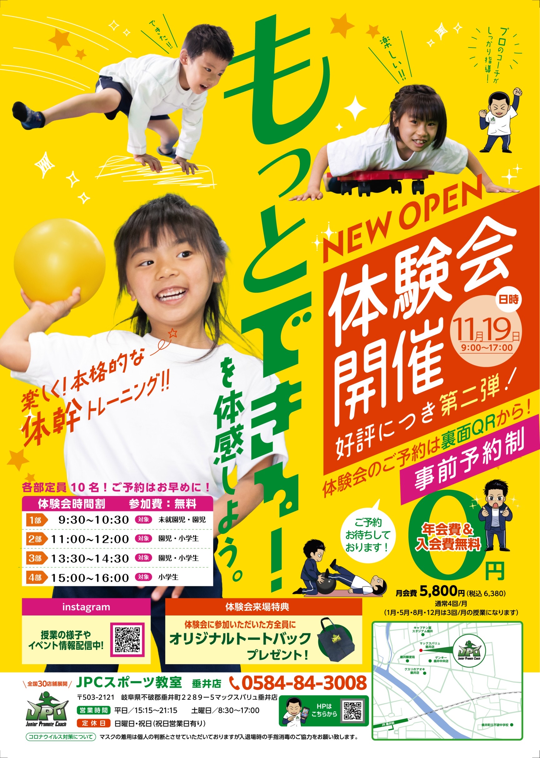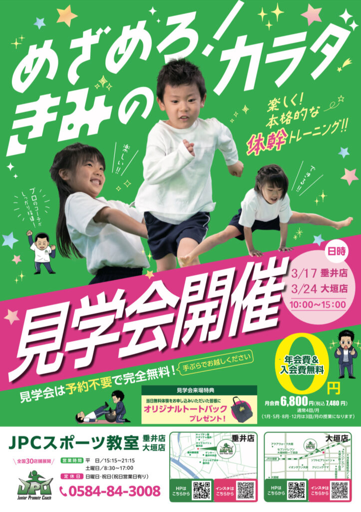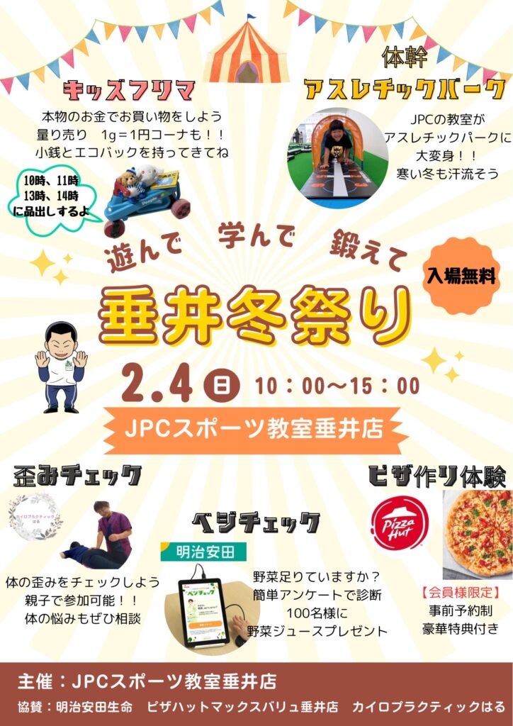 開始日時:2024年2月4日(日)10:00〜15:00場所:JPCスポーツ教室 垂井店入場無料・予約不要誰でも参加いただけますキッズフリマ、体幹アスレチックパークの他垂井町を中心とした西濃地域ブース...