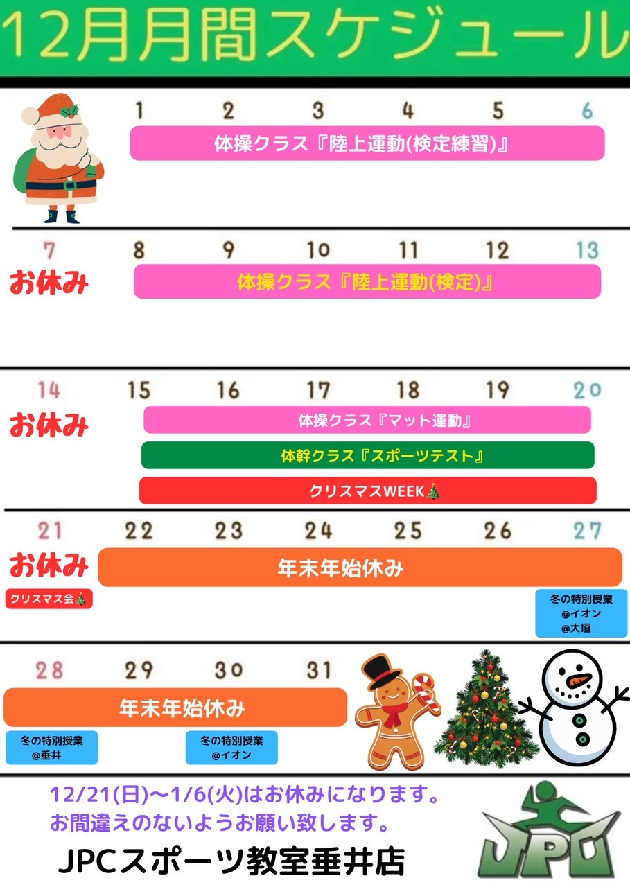 2025年の年間カレンダーと12月の月間カレンダーです。 【12月のスケジュール】 ◇体操クラスは『陸上運動』『マット運動』 2週目には小学生のみ、陸上運動運動の検定を行います❗ ◇体幹クラスは、最終...