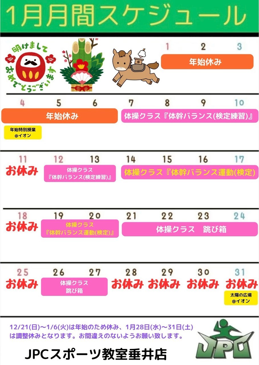 2026年の年間カレンダーと1月の月間カレンダーです。 【1月のスケジュール】 ◇体操クラスは『体幹バランス』『跳び箱』 2週目には体幹バランスの検定を行います❗ 【2026年間カレンダー】 赤枠はお...