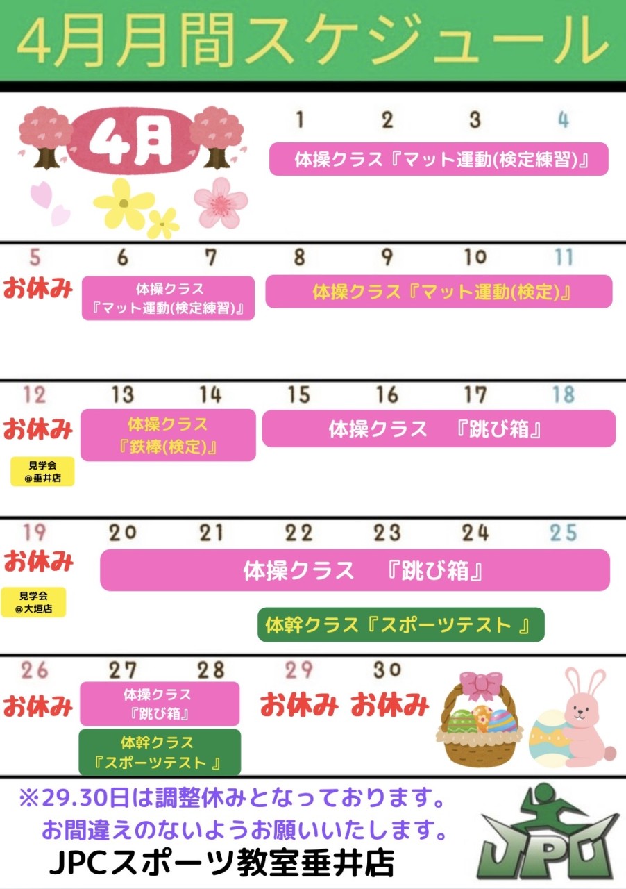2026年の年間カレンダーと4月の月間カレンダーです。 【4月のスケジュール】 ◇体操クラスは『マット運動』『跳び箱』 2週目にはマット運動の検定を行います❗ ◇体幹クラスは『スポーツテスト』を行いま...