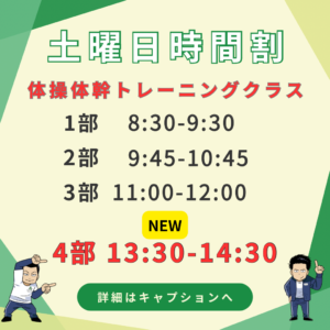こんにちは!   土曜日4部 午後の部(13:30〜14:30)開講します!   ◎体操体幹トレーニングクラス ◎土曜日 ◎13時30分〜14時30分   新規会員様はもちろん、現在の曜日や時間からご...