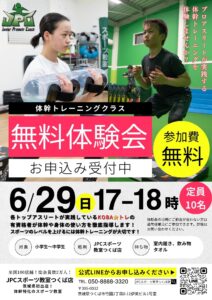こんにちは! 無料体験会やります!   体幹トレーニングクラス 6月29日(日)無料体験会を開催します! JPCスポーツ教室で各トップアスリートが実践しているKOBA⭐︎トレを無料で体験できます!  ...