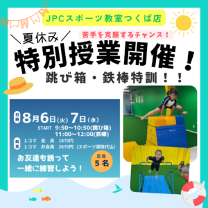こんにちは!   JPCスポーツ教室つくば店では、夏休みを活用して、跳び箱、鉄棒のレベル向上を目指すため特別授業を開催します!     【日時】 8月6日(火)  午前9時50分〜午前10時50分(跳...