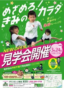 見学会のチラシが完成しましたので掲載させていただきます(*^^*) 3月24日(日)は是非JPCスポーツ教室イオンタウン鵜沼店に遊びにお越しください!