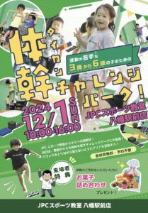 おはようございますJPCスポーツ教室八幡駅前店です! 今年も残る所1ヶ月半! 今年最後のイベント体幹チャレンジパークを12/1日曜日 10:00〜16:00の日程で開催いたします! 今回は3〜6才...