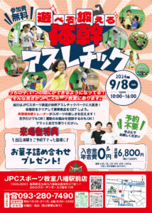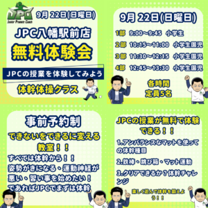 こんばんは体幹に特化した体操教室JPCスポーツ教室八幡駅前店です!! 先日のアスレチックパークたくさんのご来場ありがとうございました! また走り方教室も早々に満席となりました! という事で急遽9/22...